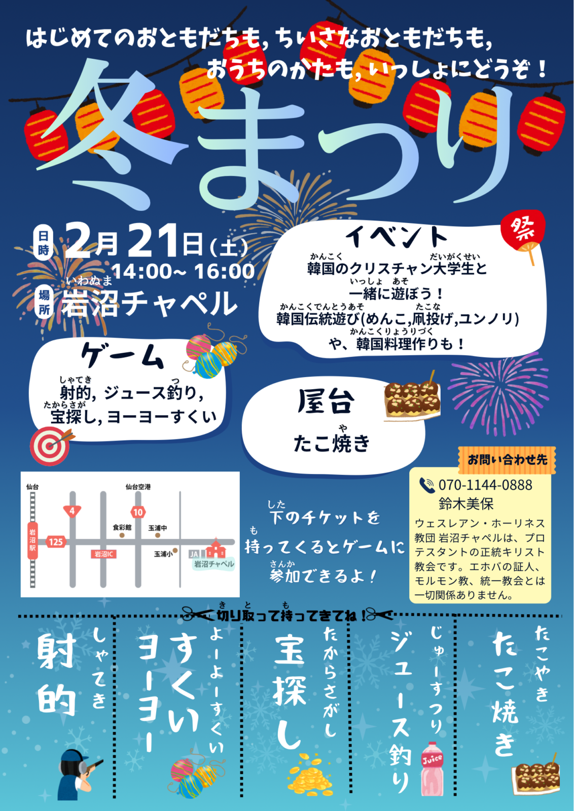 ぜひ、お気軽にお越しください。お待ちしています。疲れた者、重荷を負う者は、だれでもわたしのもとに来なさい。休ませてあげよう。(マタイ11:28)
